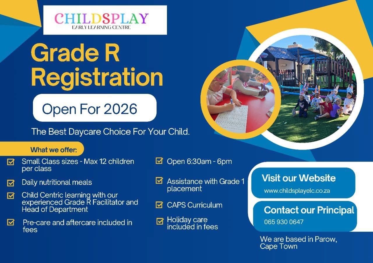 We are absolutely delighted you've considered us for your child's early learning journey! Childsplay Early Learning Centre, nestled in Clamhall, Parow, is thrilled to be a part of nurturing young minds in a warm and caring environment. We're currently accepting registrations for 2025/2026, and we'd love to welcome your little one into our loving community.